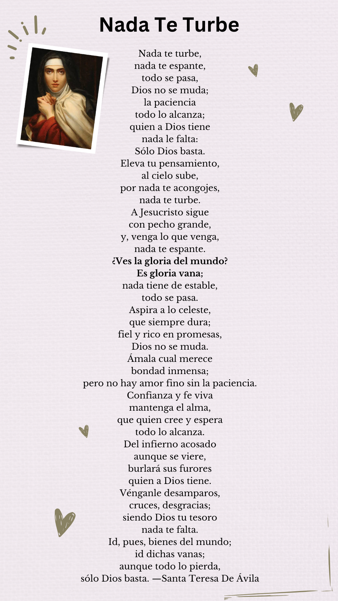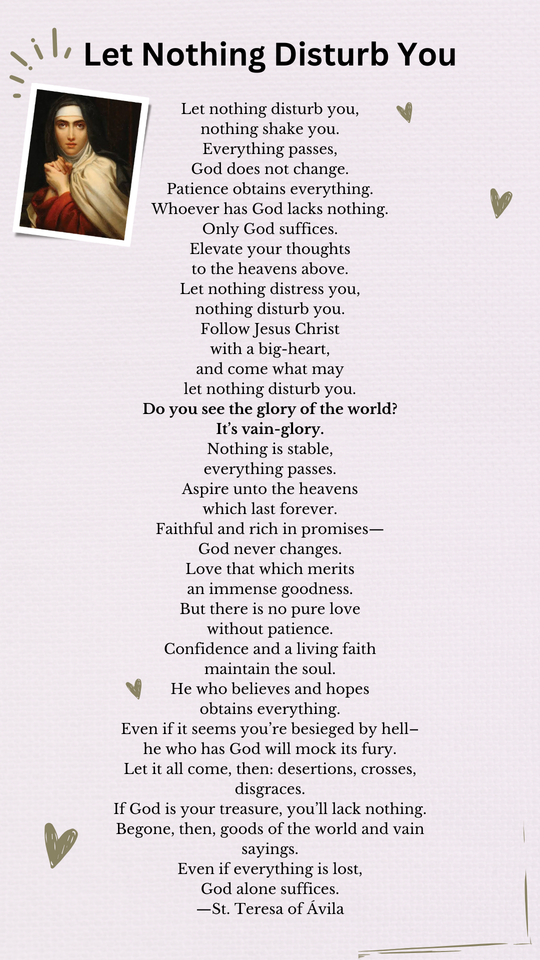 This poem speaks to my own inner anxieties—the moments when life doesn’t go the way I want, when I experience loss, or when I feel overwhelmed by the trials and tribulations of simply being human. Let nothing disturb you, let nothing shake you—everything passes. Whoever has God lacks nothing. These words sink deep into my soul, especially in moments when I feel the weight of life pressing down on me. Or when fear creeps in—the fear of the unknown, of not having every single day of my future mapped out. The uncertainties of life really ruffle my feathers. But St. Teresa reminds me to elevate my thoughts, to shift my perspective even in moments of pain, betrayal, loneliness, misunderstanding, or the growing noise of social unrest that seems louder every day. This poem gently urges me to seek grace in difficult times and to trust that this too shall pass.